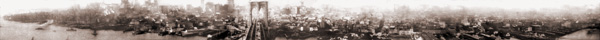 SUMMARY (From Library of Congress researchers) The view was taken from the tower on the Brooklyn side of the bridge. As the film begins, the camera is looking southwest, towards the southern tip of Manhattan (the Battery). The camera pans very rapidly north following Manhattan's East River shoreline, across the bridge span itself and the bridge's New York side tower, following the shoreline further north towards Corlear's Hook, where the film ends. Some visible landmarks include the Fulton Fish Market buildings at Fulton and South Streets (currently the site of the South Street Seaport Museum); north of the bridge tower is the Catherine Slip, where a Catherine Street Ferry is docked. |